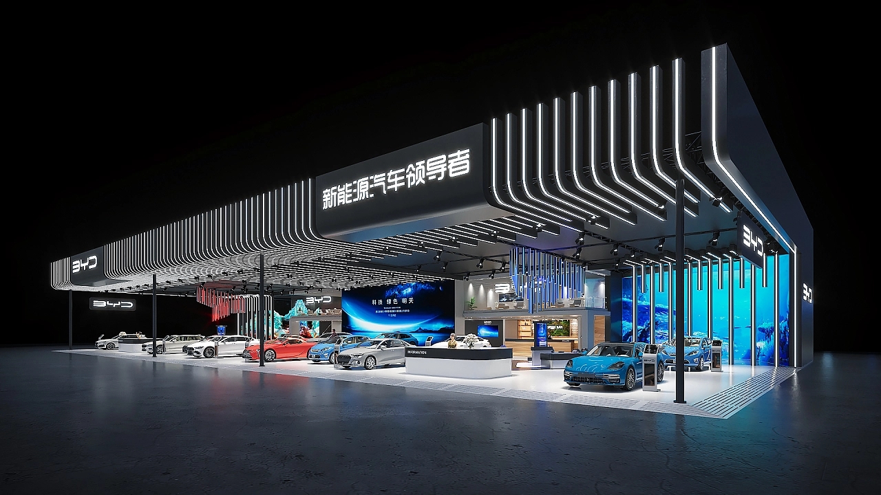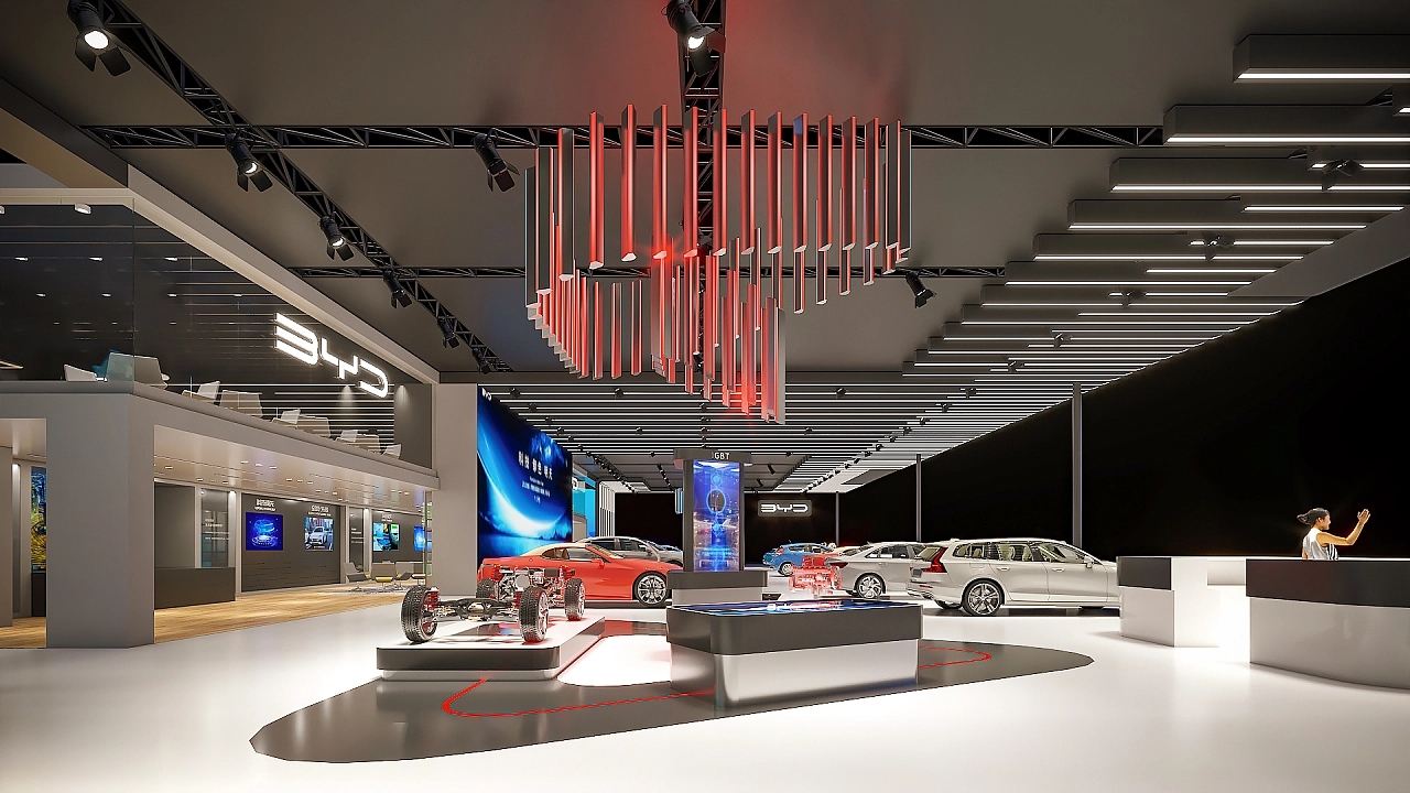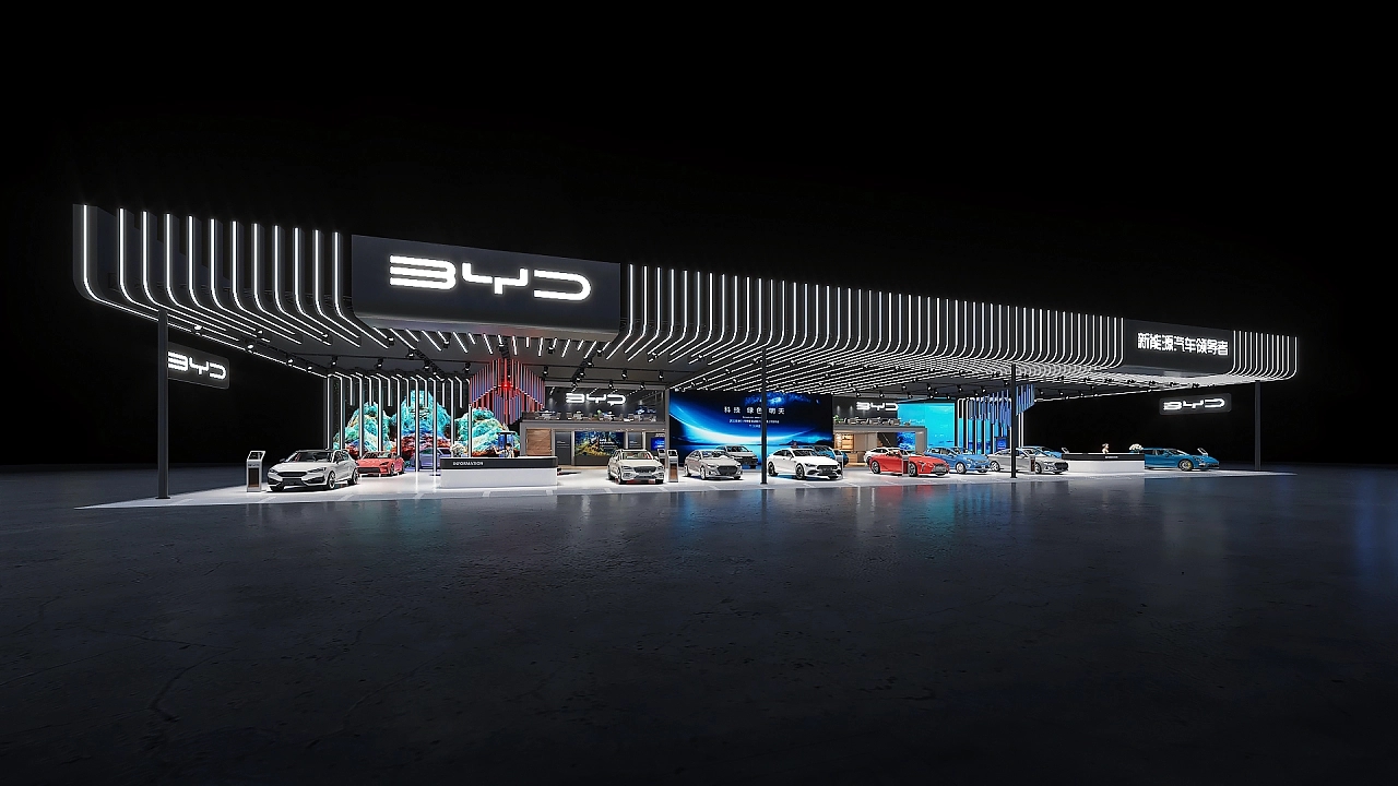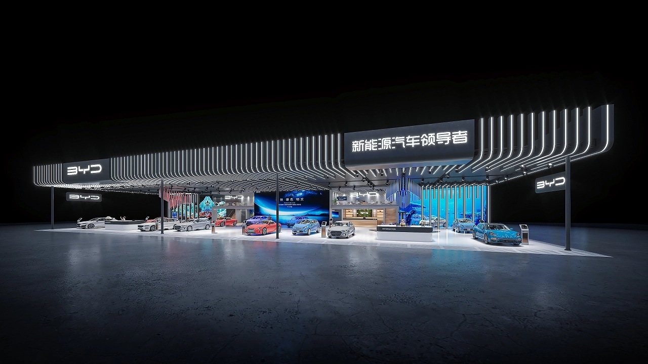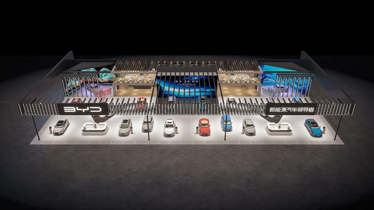 比亞迪該車展展臺整體造型非常的炫酷,頂部造型通過眾多燈光條的延伸,讓參展的觀眾能集中他們的視線焦點,使得該展位在展館眾多展臺中脫穎而出,一樓為車展展示車輛和接待區,二樓布置了洽談區和吧臺,讓展會觀展的客戶能體驗到優秀的服務,提高會展中的成交量。