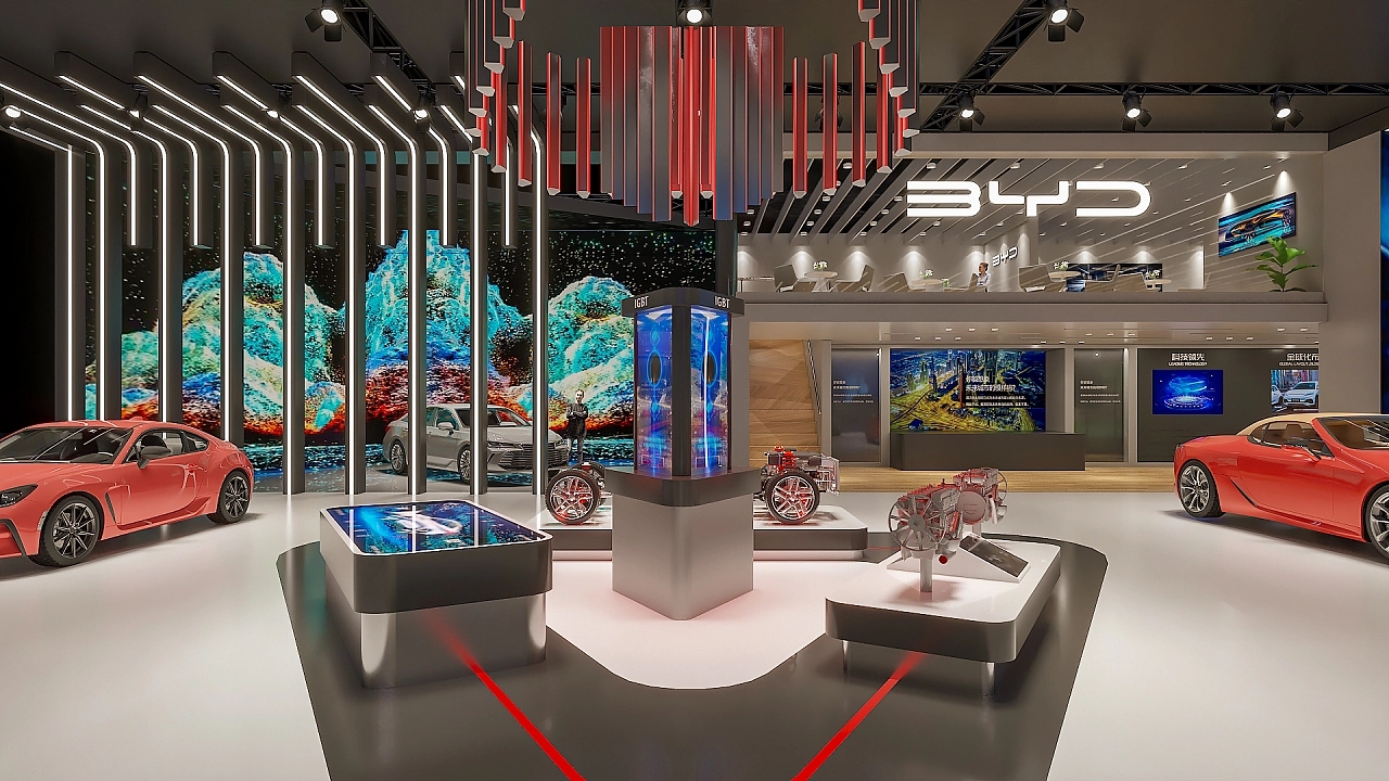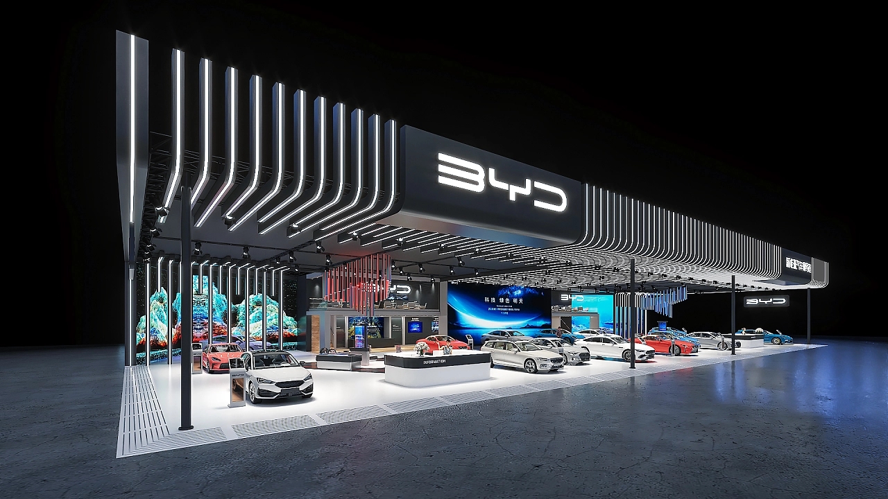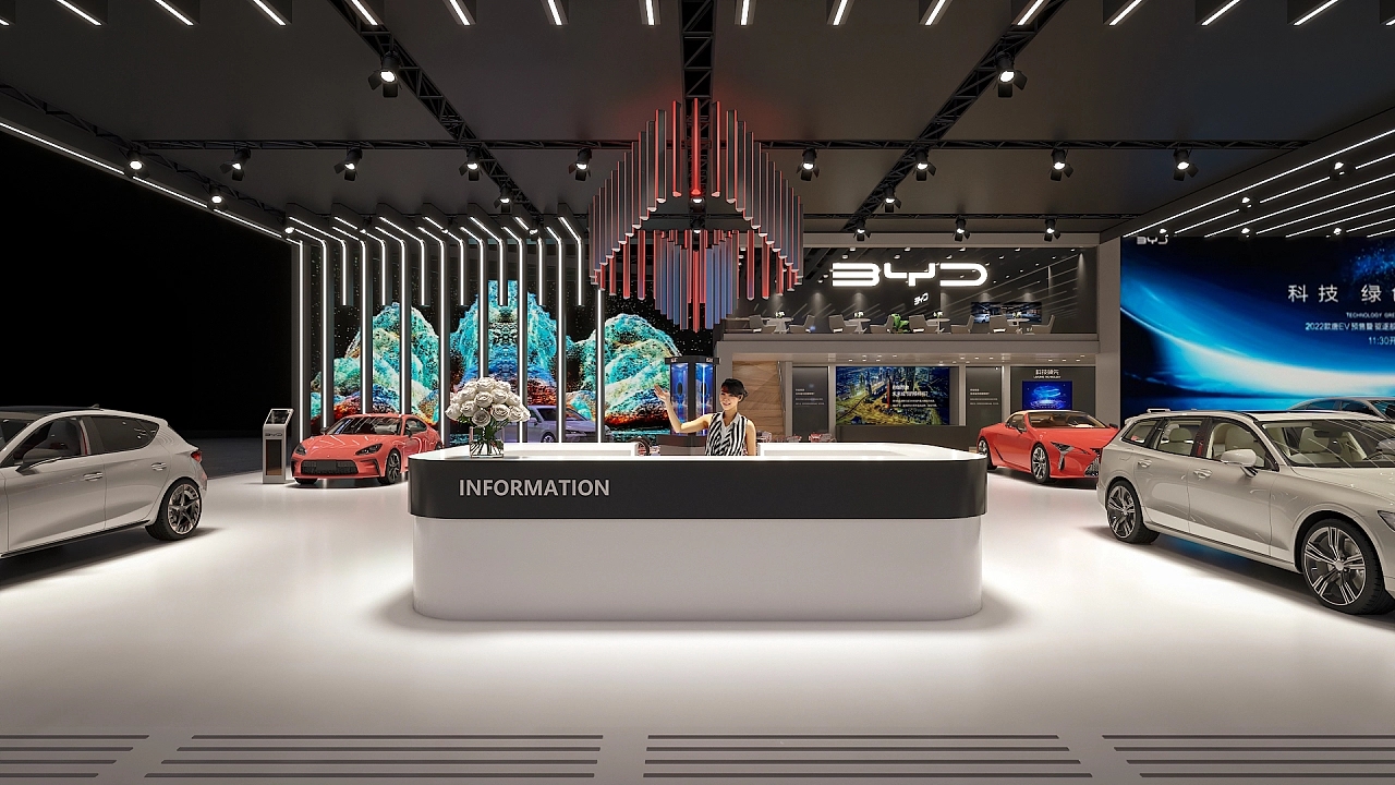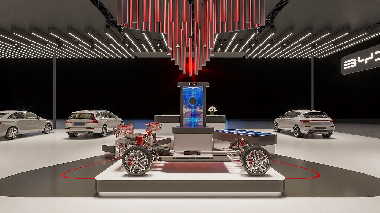 比亞迪該車展展臺整體造型非常的炫酷,頂部造型通過眾多燈光條的延伸,讓參展的觀眾能集中他們的視線焦點,使得該展位在展館眾多展臺中脫穎而出,一樓為車展展示車輛和接待區,二樓布置了洽談區和吧臺,讓展會觀展的客戶能體驗到優秀的服務,提高會展中的成交量。