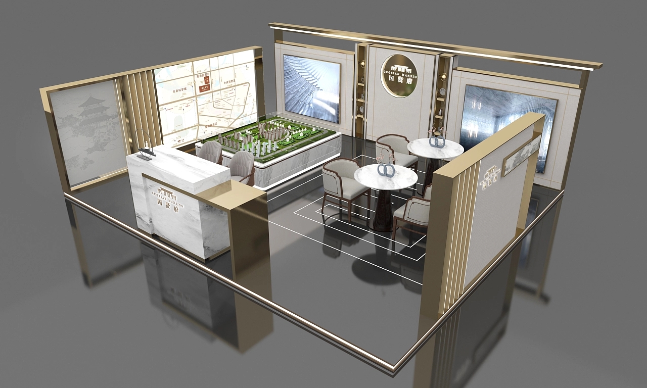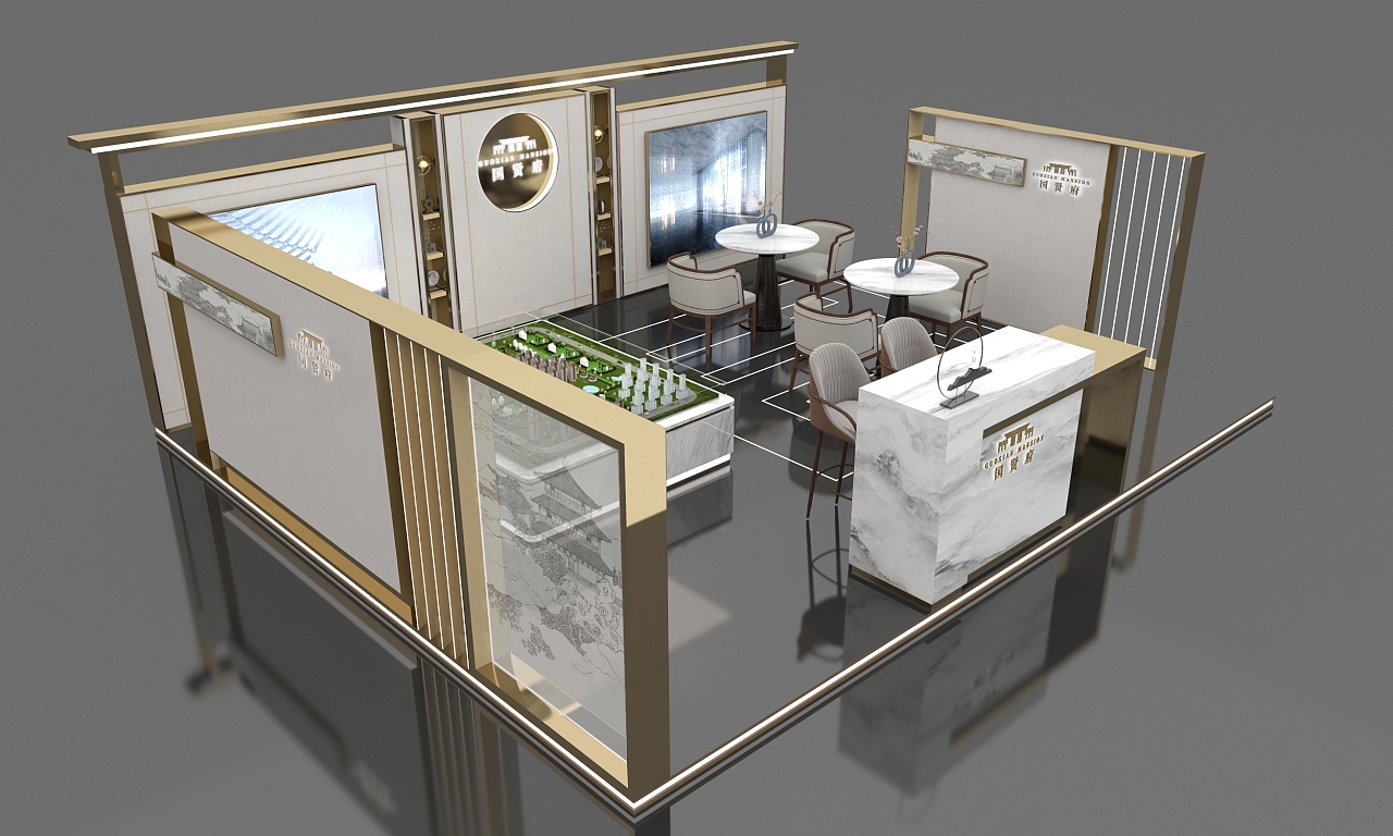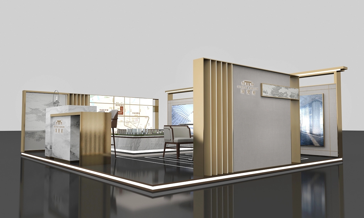 該展臺搭建面積為56平,整個展臺設計主要分為前臺接待區、客戶洽談區、樓盤展示區三個區域,整體設計搭建十分簡潔大方,在展臺裝修搭建上使用的材質低調又有質感,給參展客戶一種高端的空間氛圍感。