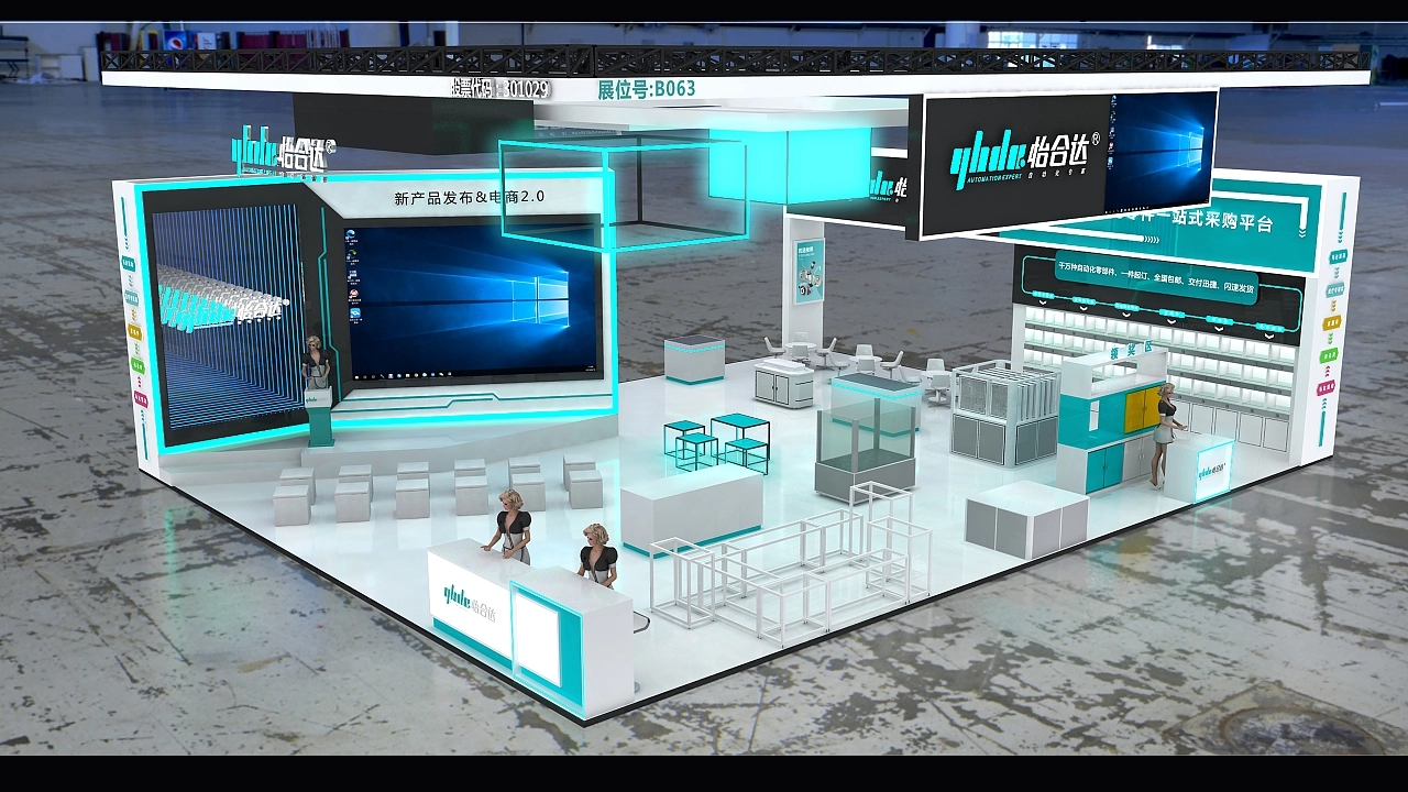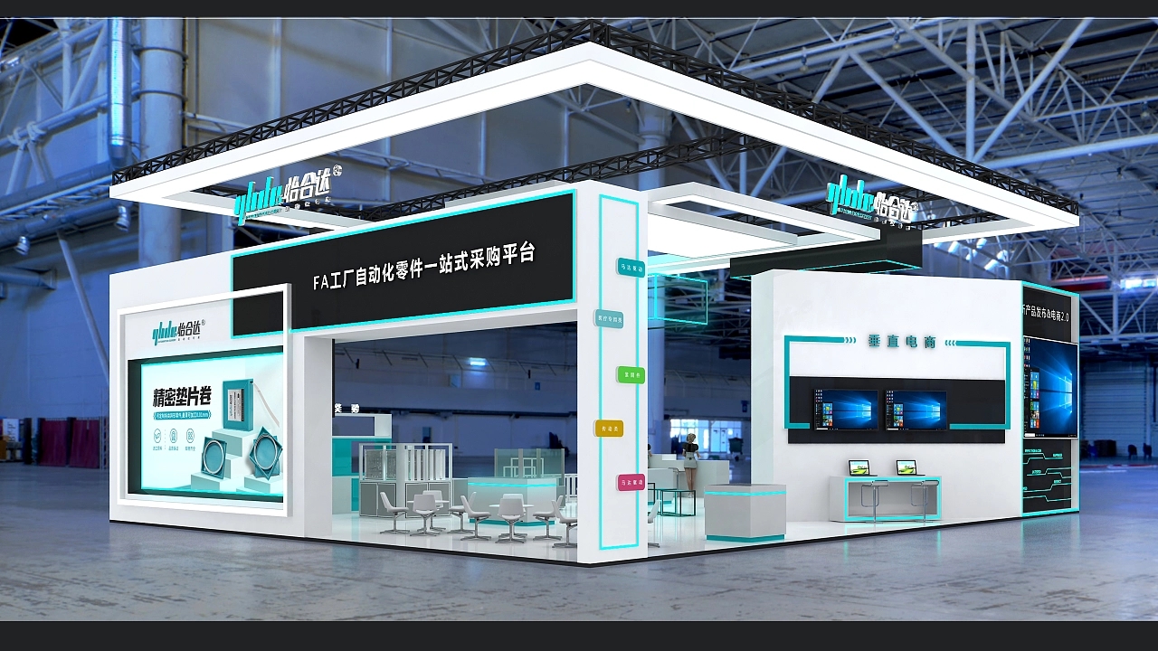 該展臺搭建面積為180平方米,整個展位設計布局分為接待區、舞臺區、工廠機器展示區、洽談區、電商區等各功能區。整個展臺設計色彩使用了青色與白色相搭配,打造了一個簡約大方的科技風格的展臺空間。