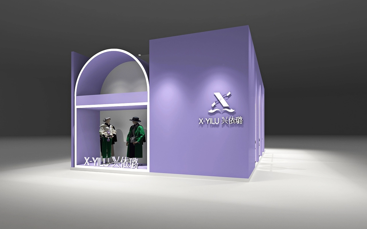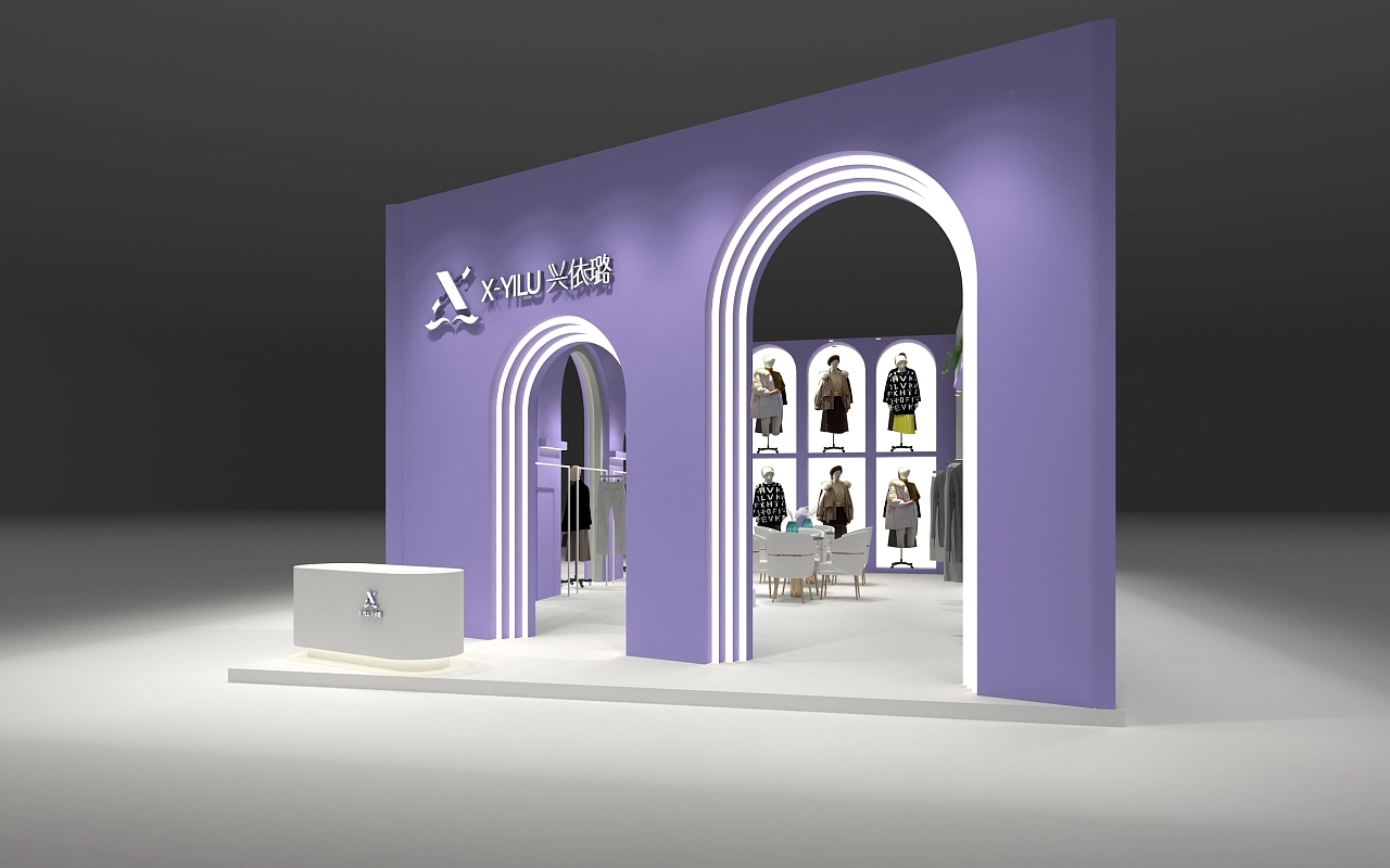 展臺設計搭建面積為72平方米,在造型上融合了歐式展臺的風格,在外墻部分使用了大小不一的圓形拱門,整個展臺以紫色作為主要色彩,體現出該展臺簡單時尚、典雅清幽的空間氛圍。展臺設計內部在一側面墻上搭建了內嵌的模特展示架,搭配燈光,使得會展觀眾能清晰直接的感受該企業服飾的優劣,促進訂單的成交。